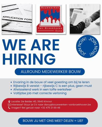 Davy Van Broekhoven Bouwwerken BV is een groeiend en dynamisch bouwbedrijf gevestigd in Ophoven (De Belder 40, 3640 Kinrooi). We realiseren uiteenlopende projecten, van ruwbouw tot afwerking, en zoeken ter versterking van ons team een allround medewerker.
